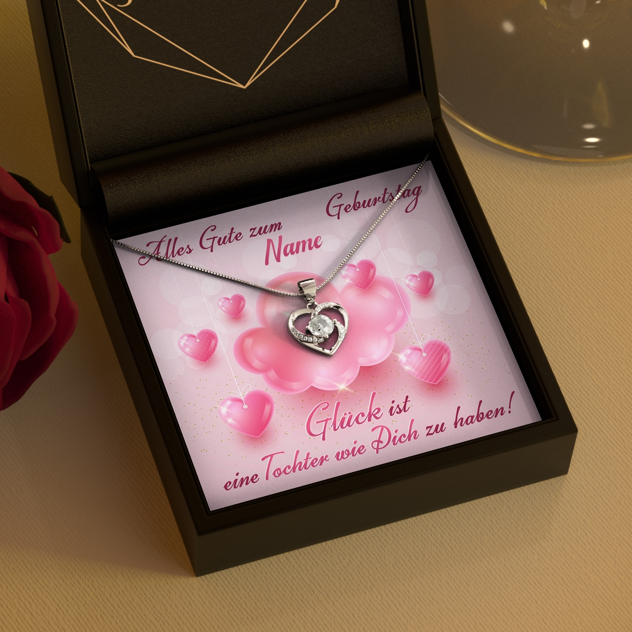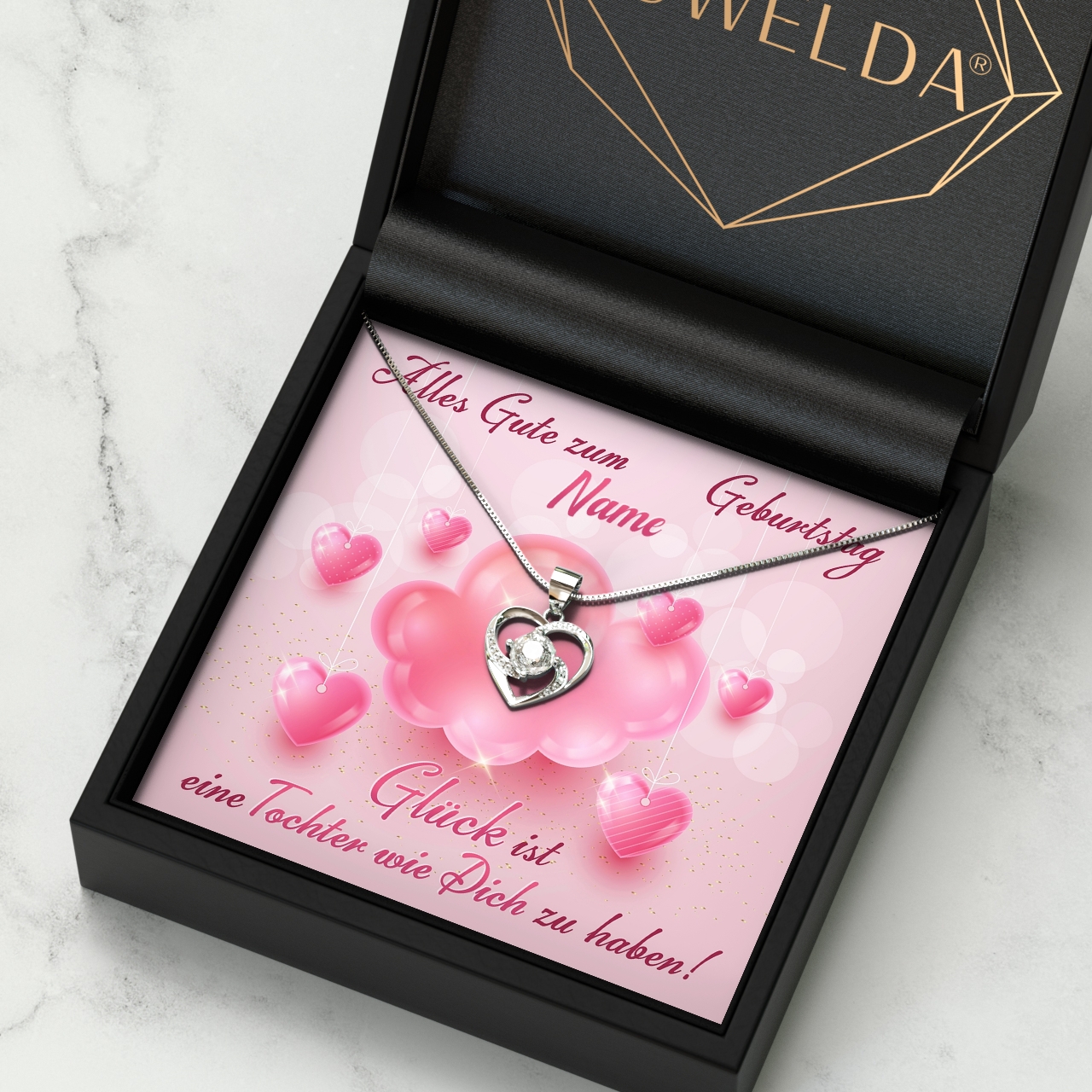 Eine Tochter feiert Geburtstag? Dann ist eine personalisierte Schmuckbox genau passend. Das „Tochter des Glücks“ Design unserer Grußkarte lässt sich mit den Namen Deiner Liebsten und mit ihrem Alter individuell gestalten. Die personalisierte Grußkarte ist in verspieltem Pink gehalten und zeigt eine flauschige Wolke wie schwebende Herzen. Die herzlichen Glückwünsche sind perfekt, um ein Lächeln in das Gesicht Deiner Tochter zu zaubern.